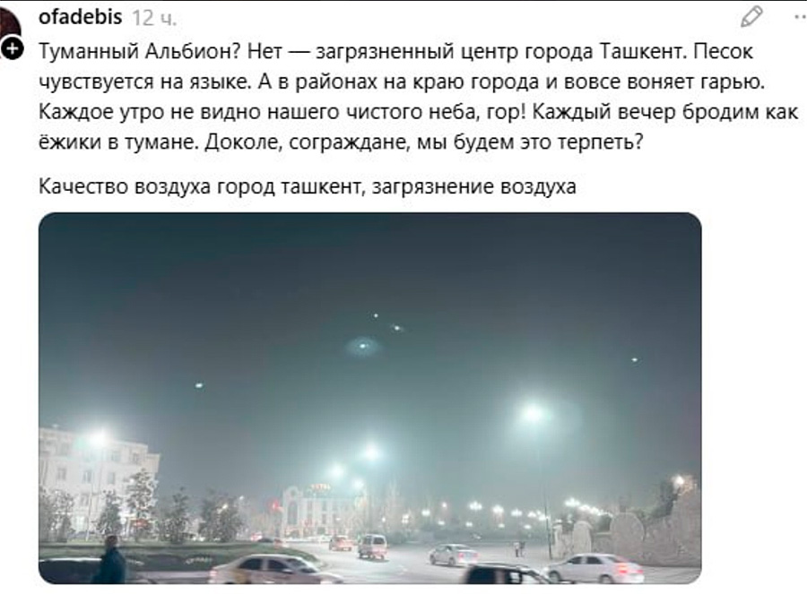 Insbesondere lag am 20. November laut Daten automatischer Überwachungsstationen der Gehalt an Feinstaubpartikeln PM10 in der Luft von Taschkent bei 299 Mikrogramm pro Kubikmeter, was die maximal zulässige Konzentration (300 µg/m³) nicht überschritt. Der PM2.5-Wert erreichte jedoch 202 µg/m³ und übertraf damit den Grenzwert um das 3,4-fache (60 µg/m³).