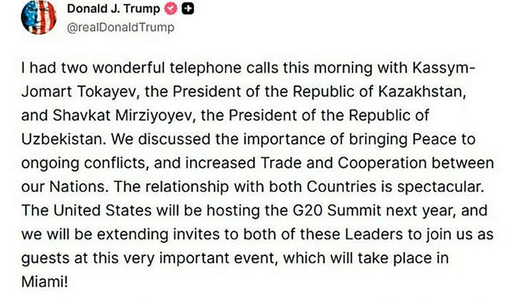 „Heute Morgen hatte ich zwei wunderbare Telefongespräche mit Qassym-Schomart Toqajew, dem Präsidenten der Republik Kasachstan, und Shavkat Mirziyoyev, dem Präsidenten der Republik Usbekistan. Wir besprachen die Bedeutung der Herstellung von Frieden in den aktuellen Konflikten sowie die Ausweitung von Handel und Zusammenarbeit zwischen unseren Ländern. Die Beziehungen zu beiden Ländern sind ausgezeichnet. Im nächsten Jahr werden die Vereinigten Staaten den G20-Gipfel ausrichten, und wir werden beiden Führern Einladungen zukommen lassen, uns als Gäste bei diesem sehr wichtigen Ereignis in Miami zu begleiten!“, heißt es in Trumps Beitrag.