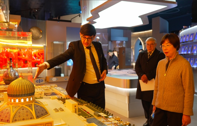 Zunächst besichtigte die Delegation die „Halle des Ruhms“, in der durch architektonische und künstlerische Gestaltung die Bilder großer Denker und Staatsmänner, die aus Zentralasien stammen, präsentiert werden. Im Bereich, der der vorislamischen Zeit gewidmet ist, wurden die Kultur des alten Choresmien, Sogdiens und Baktriens, das Erbe der „Avesta“ sowie archäologische Funde gezeigt.